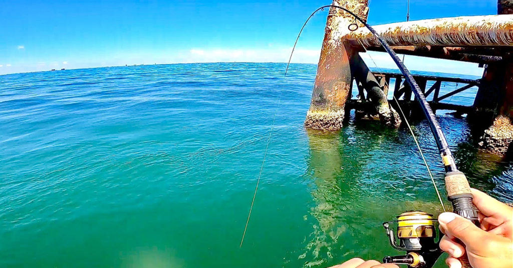 The best chance for success when fishing structures or pilings for big fish is using a shrimp imitation lure with the current.