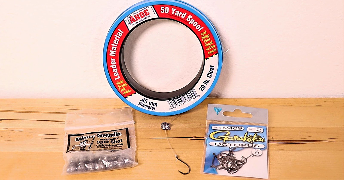All you need to assemble it is a small hook, a split shot weight, and leader material.